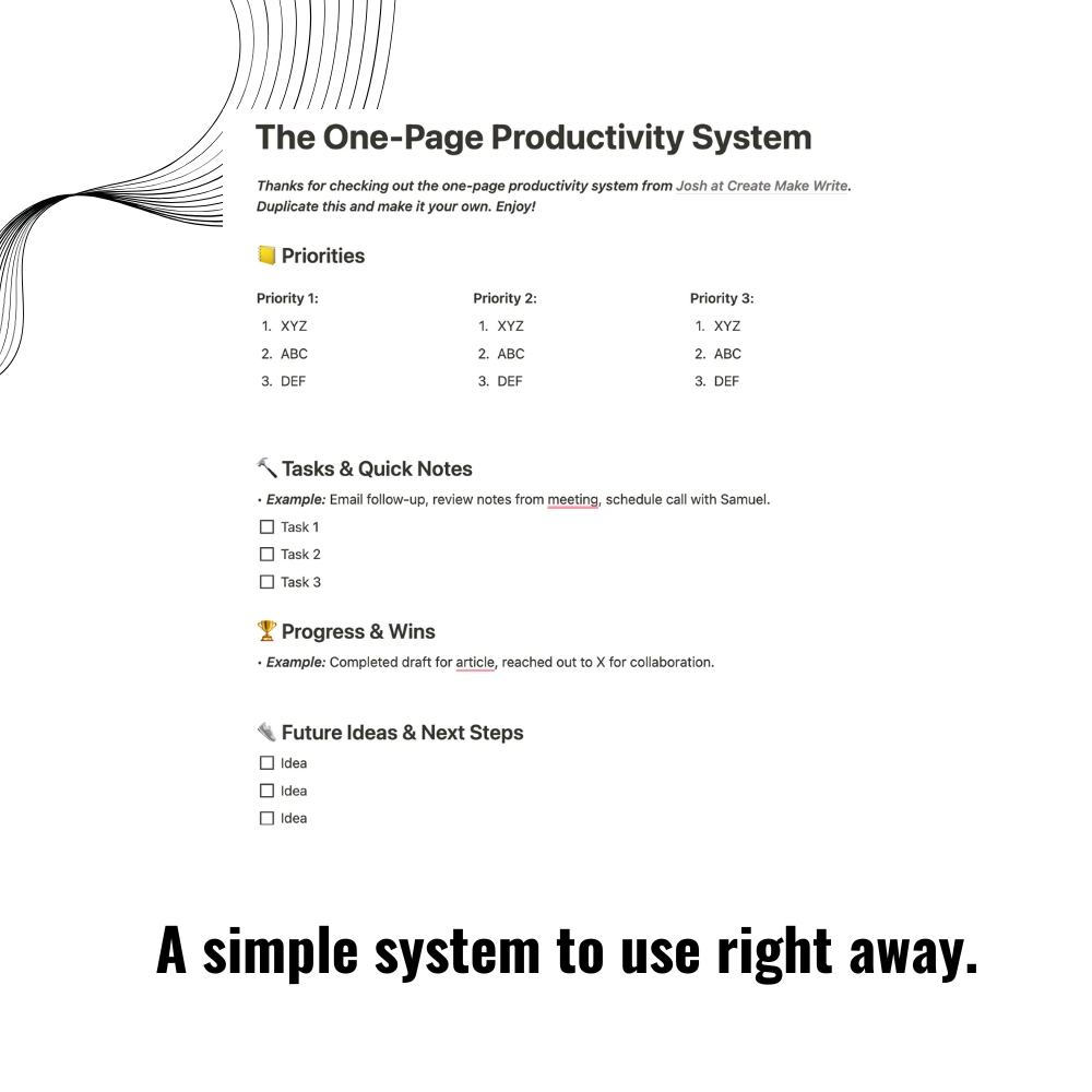 A revolutionary single-page system that cuts through productivity noise and deliverslaser-focused results. No more overwhelm, just pure execution.